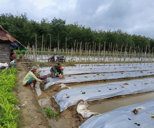 OKU – Babinsa Koramil 14/SS III Kodim 0403/OKU Pratu Rama melaksanakan komsos dan membantu warga di wilayah binaannya menanam bibit buah melon