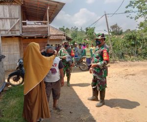 Kodim OKU – Anggota Babinsa Koramil 403-11/Pulau Beringin, Kodim 0403/OKU Sertu Heri Mariyanto dan Serda Susanto bersama perangkat Desa Pulau Beringin bagikan