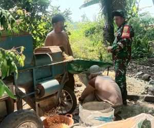 OKU – Babinsa Koramil 09/Muaradua Kisam Serda Ganda membantu warga Bapak Iwan salah satu anggota kelompok tani Jaya menggunakan mesin pemipil. Serda